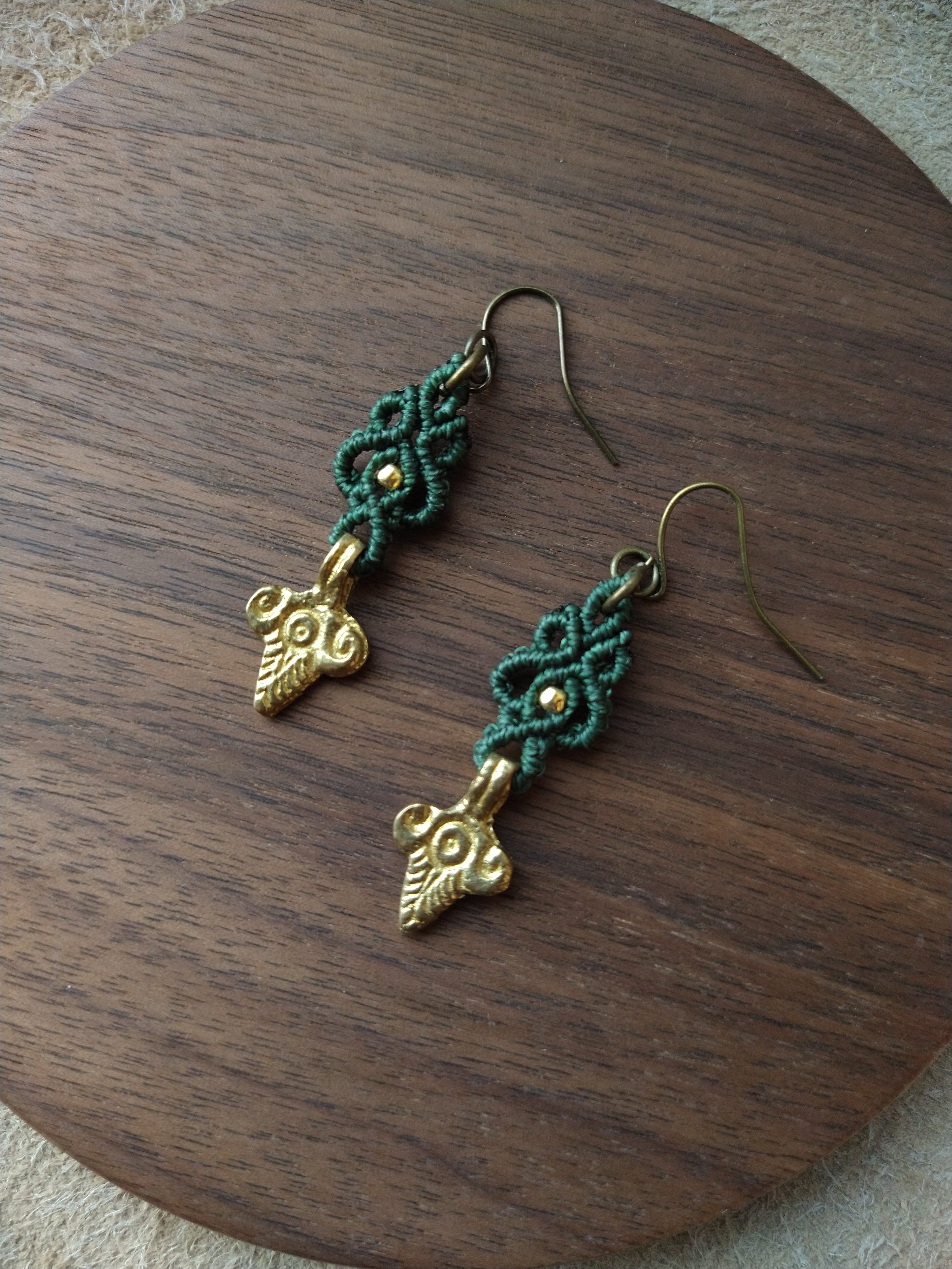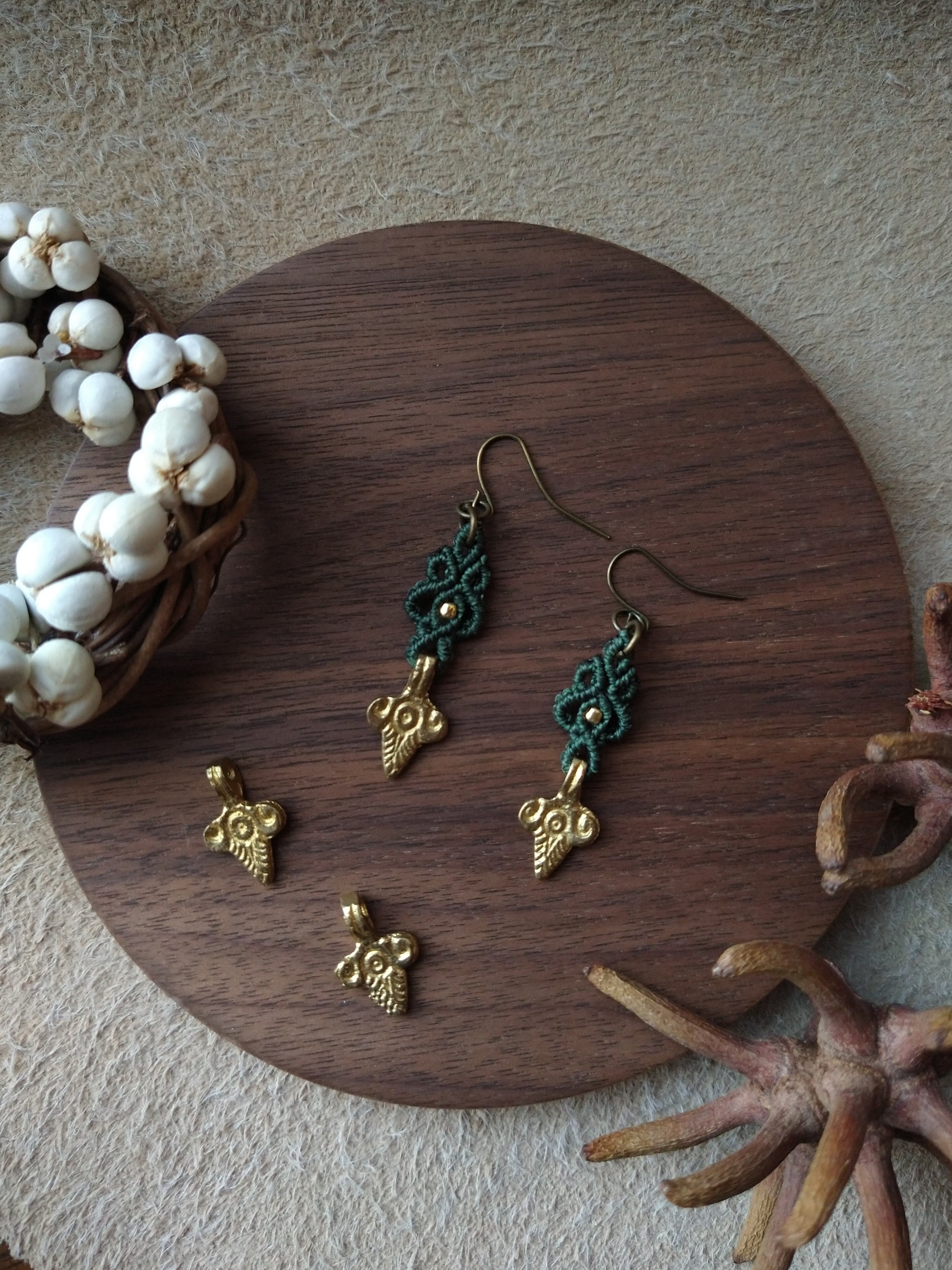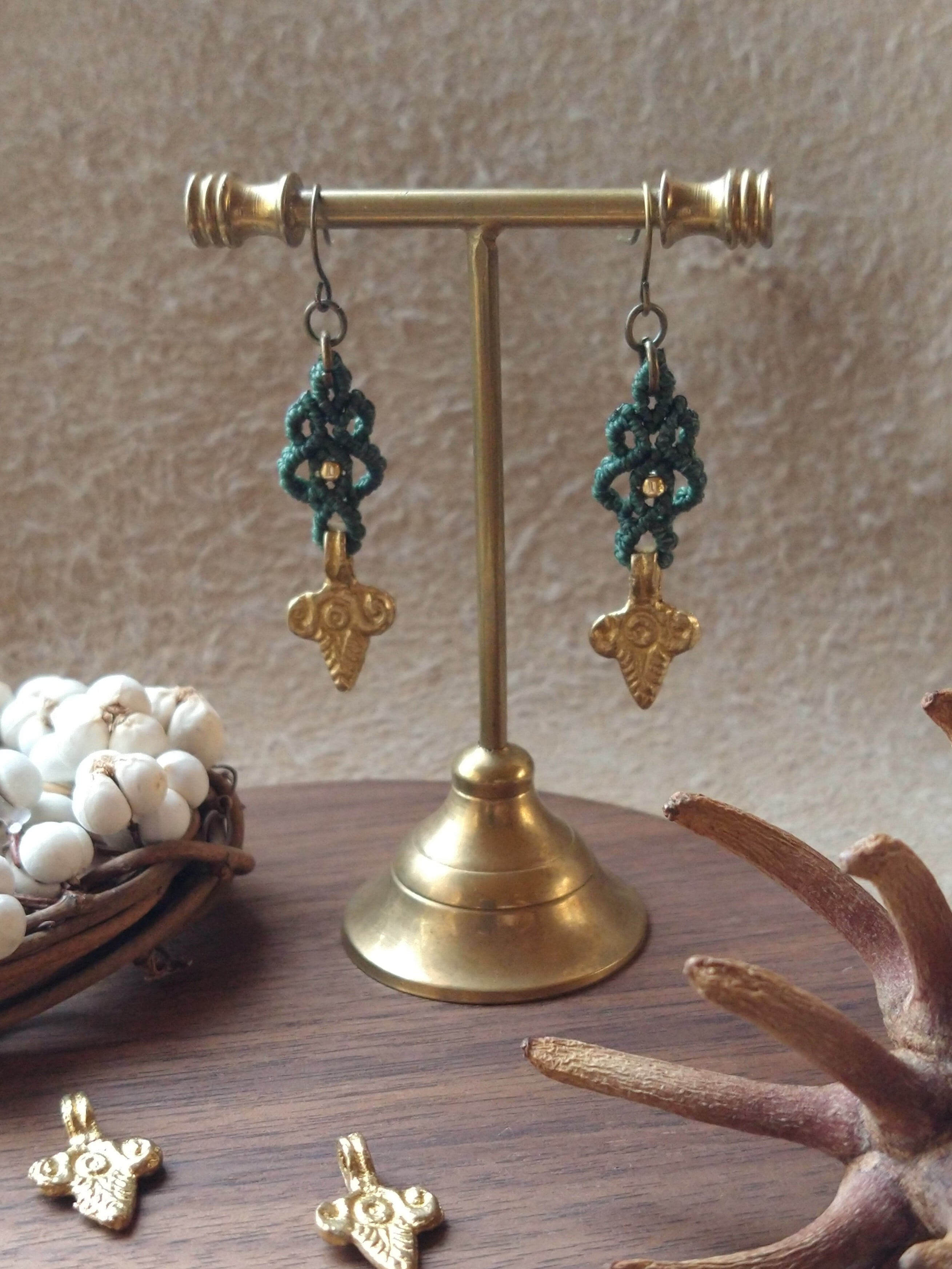 インド製真鍮パーツをあしらったマクラメ編みのピアスになります。